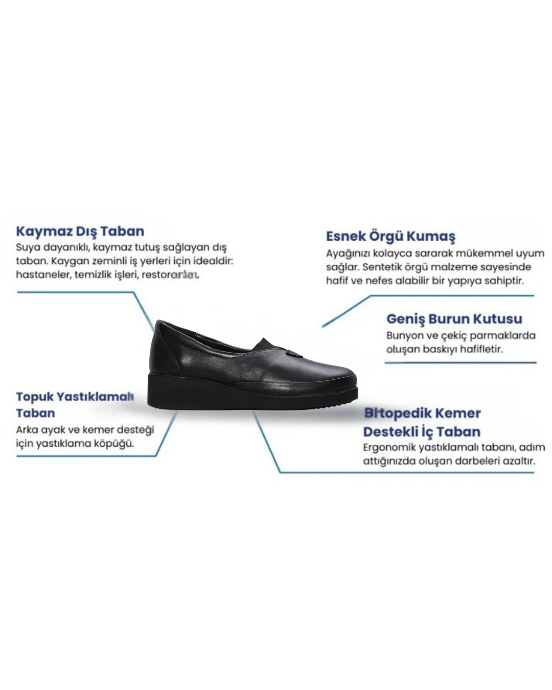Ortopedik destekli, ayak sağlığına özel tasarlanmış konforlu ve şık ayakkabılardır.
