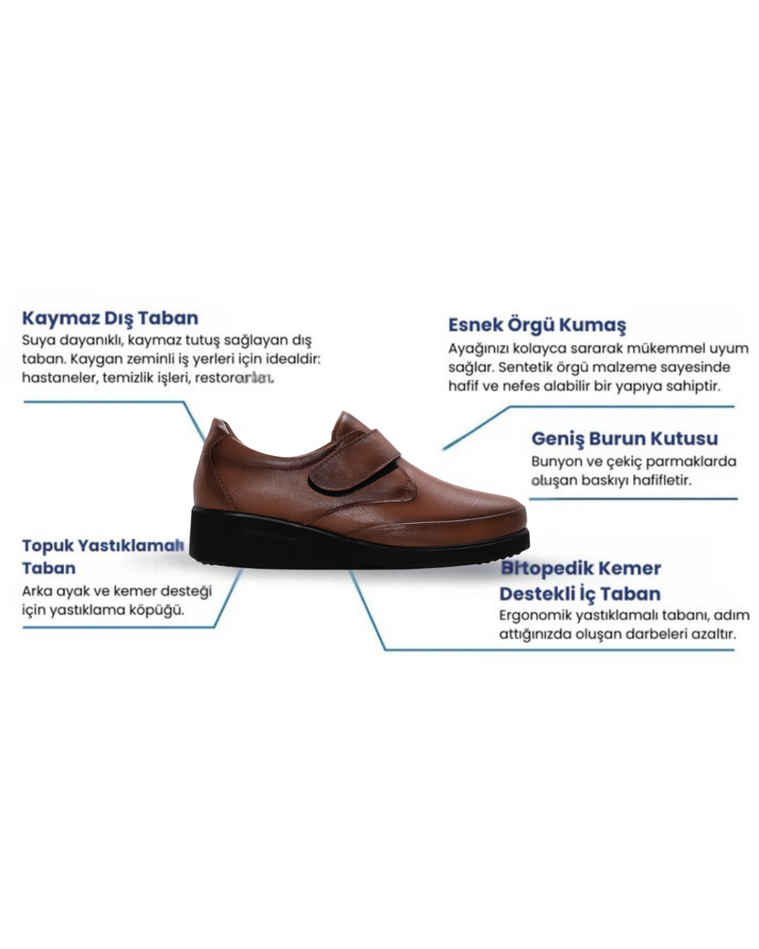 Ortopedik destekli, ayak sağlığına özel tasarlanmış konforlu ve şık ayakkabılardır.